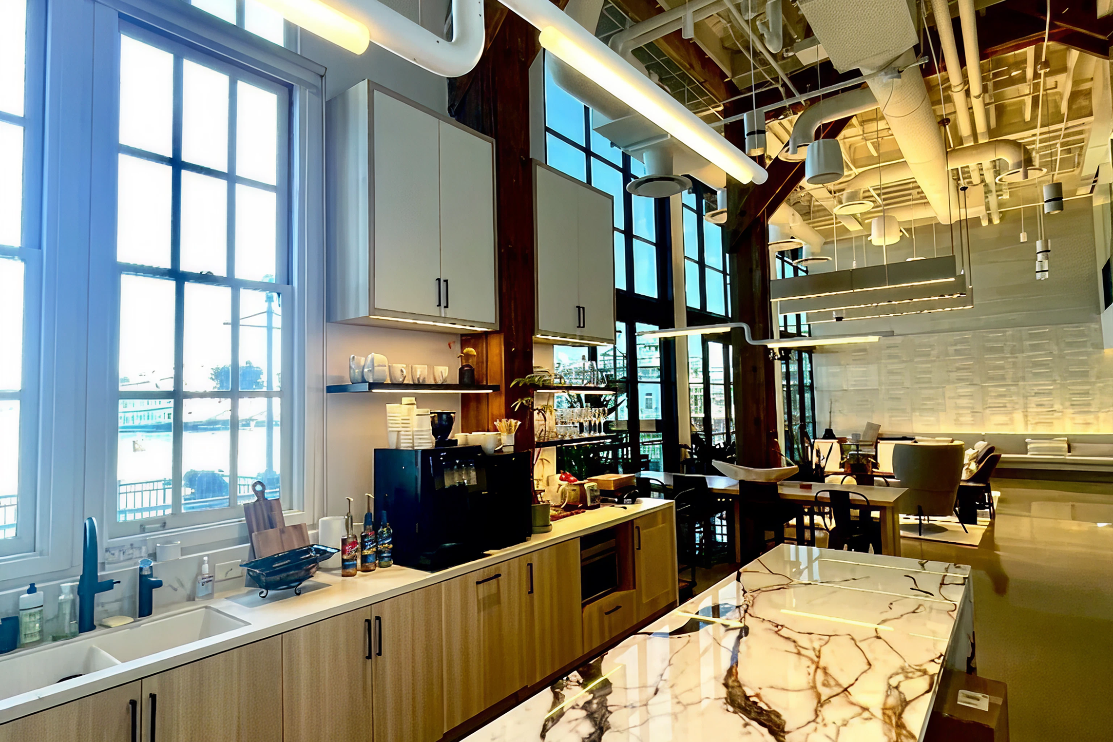 This exciting project is located at the historic Port of San Francisco at Pier 5. The space included three levels, including an expanded mezzanine, and connected by a new 3-story stair. Extensive design efforts ensured optimized acoustics as well cutting edge AV systems. Being situated above and adjacent to an active and popular restaurant, careful planning and consideration was needed in order to relocate the restaurants exhaust system through the new space with minimal disruption to the restaurant’s service. While highlighting the large timber frame interior, the building maintained stunning views of the bay and waterfront at almost every angle.