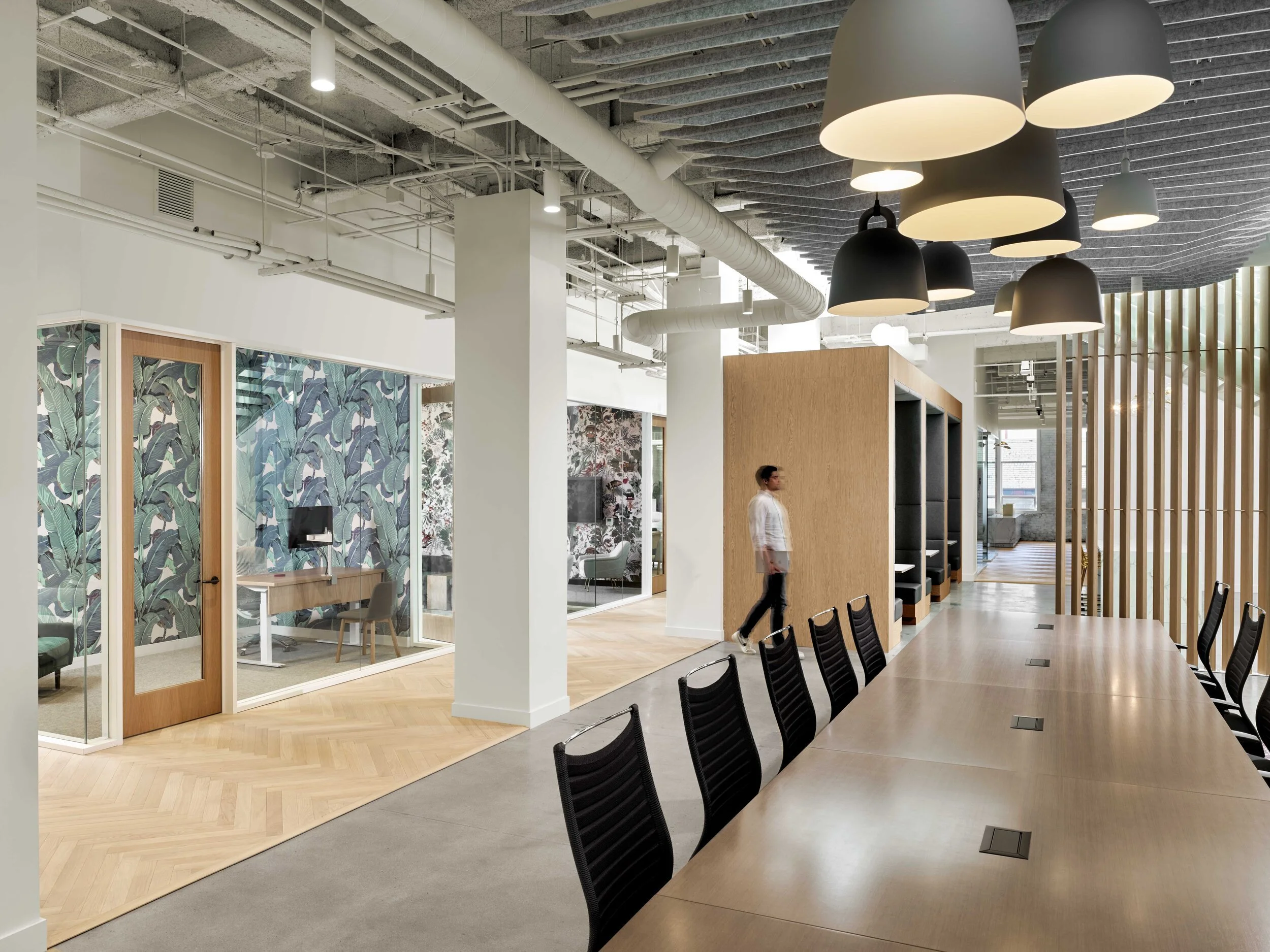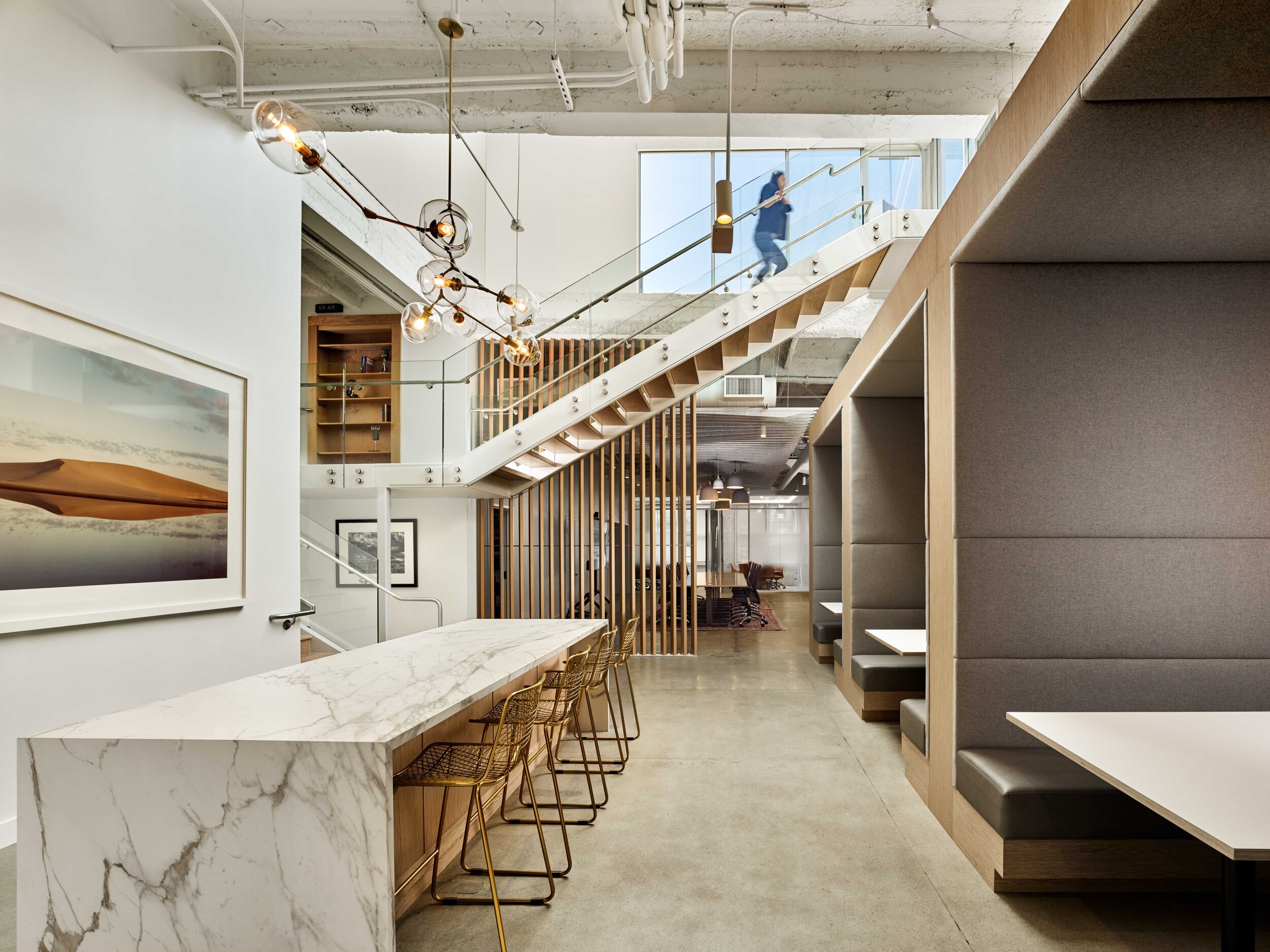 For their San Francisco office, Redpoint Ventures leased a beautiful interior/exterior space that extended to the roof top in a building on Maiden Lane. Redpoint Ventures and Canopy worked with TMDA to design and build an open, welcoming, yet refined new space. The scope included new conference rooms with an integrated AV system, a kitchen, and an impressive pergola on the roof. The project also boasts a new exposed stairway to the roof with a hidden library at the mezzanine.